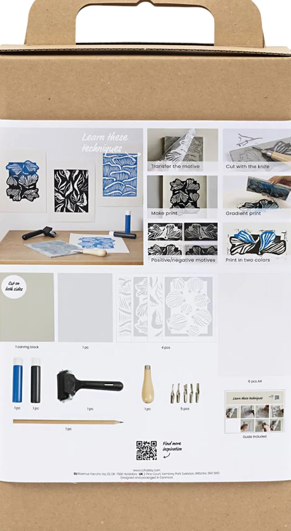 Med dette kit kan du lære at lave fine, grafiske print til væggen. Skabt i samarbejde med Krista Tolstrup. Indeholder materialer til to prints, og al den vejledning du behøver. Vil du lære at lave smukke kunstprint, der ligner linoleumstryk på en prik? Så er dette starterkit perfekt. Her får du alt, hvad du skal bruge for at komme godt i gang. Scanner du QR-koden på æsken, bliver du ført direkte ind i vores læringsunivers. Her kan du se videoer, som guider dig igennem hele bloktryks-processen inkl. hvordan du overfører motiver til trykpladen, hvordan du skærer med knivene og hvordan du trykker det endelige print. Til slut har du to, fine illustrationer i blå og sorte nuancer, som er perfekt til billedvæggen derhjemme.