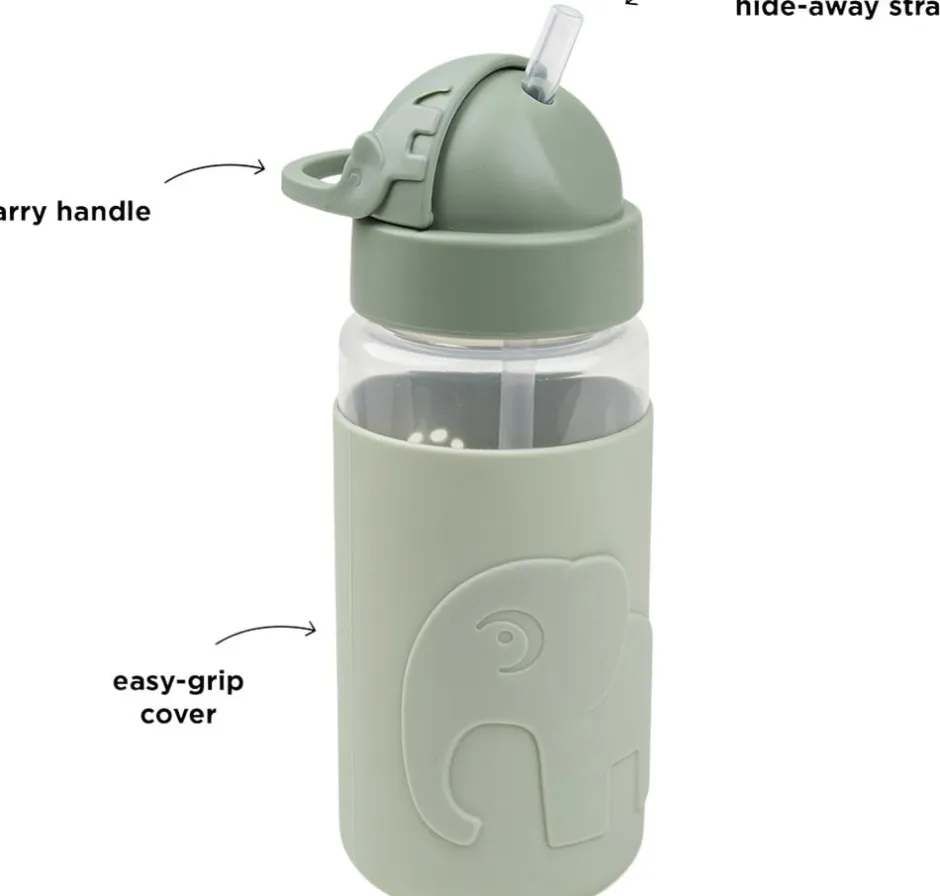 Den søde drikkedunk med sugerør og et easy-grip omslag passer perfekt i ungernes rygsæk. Drikkeflasken har et smart sugerør, der kan gemmes i låget og forhindrer at væske spildes. Håndtaget hjælper de små hænder til at finde sugerøret frem igen. Den spildfrie børne-drikkeflaske er uundværlig på farten og gør det sjovt for barnet at drikke masser af vand. Silikone-omslaget sikrer et godt greb og et ekstra sugerør samt mundstykke er inkluderet. Silikone-omslaget er præget med Elphee og grønne toner pryder vandflasken.