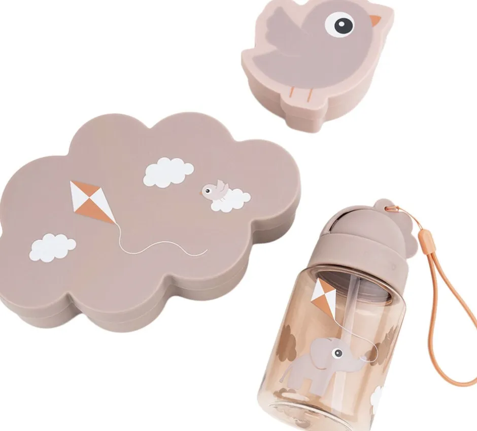 Pudderfarvet sæt der indeholder drikkedunk med sugerør, snackboks og madkasse