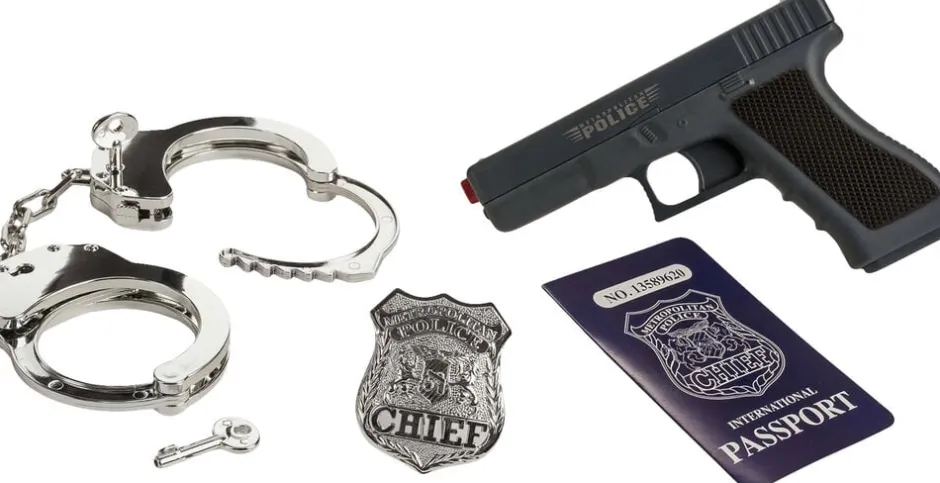 Politisæt Pistol med tilbageslag, realistiske affyringslyde og lys, håndjern, politiskilt og -pas Inkl 2 stk knapcellebatterier