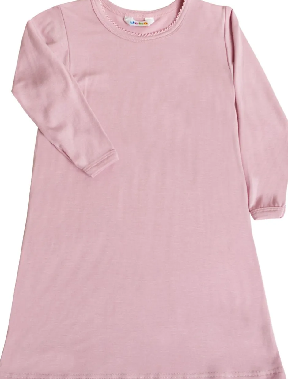 Natkjole i A-facon med lange ærmer. Piquette stikning i halsen som sød detalje. Dejlig blød, elastisk og økologisk bambuskvalitet som er dejlig behagelig at have på. Ensfarvet. Oeko-tex 100 mærket.