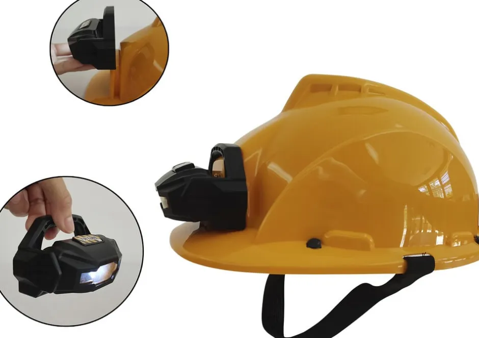 Sikkerhedshjelmen fra Power X med aftagelig og bærbar pandelampe, er et nødvendigt udstyr for alle håndværkere på en byggeplads Så inden din lille håndværker på tager sig byggekonstruktionsopgaver er det meget vigtigt at iføre sig en sikkerhedshjelm Power Xs sikkerhedshjelm har en aftagelig og justerbar hagerem, som sik rer at hjelmen passer barnet og bliver siddende selvom der kan være vilde håndværkeropgaver i legen På byggepladsen kan det være nødvendigt med ekstra lys på de t arbejde, der skal udføres og derfor medfølger en praktisk og justerbar pandelampe, der gør at begge hænder kan bruges samtidig med at man får lys Pandelampen er samtidig aftagelig og kan bruges som lygte, hvis håndværkeren skal tjekke installationer el lign i små hulrum Pandelampen bruger 3xLR44 batterier som medfølg er Power X hjelmen er naturligvis i gul farve med sorte stribe, så man tydeligt ses på byggepladsen af andre og giver et autentisk udseende Hjelmen er lavet i P P plastik materiale og uden ska