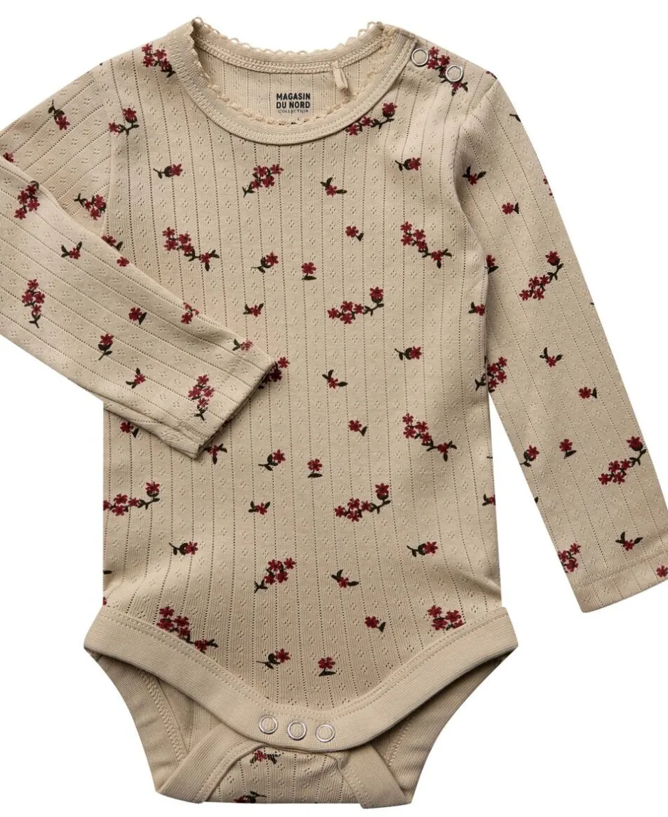 Body fra Magasin du Nord Collection i den blødeste kvalitet af 100% økologisk bomuld med GOTS-certificering. Bodyen er enkel i modellen med lange ærmer, ribkanter, en rund halsudskæring, en tætsiddende pasform, trykknapper i kilen og ved den ene skulder samt et fint hulmønster og et blomstret print. En skøn body i den lækreste kvalitet.