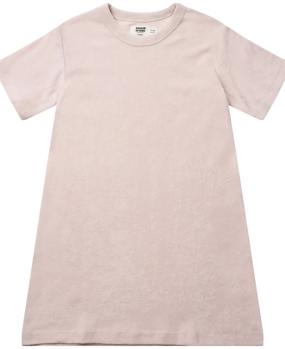 Kjole fra Magasin du Nord Collection i den blødeste kvalitet af 100% økologisk bomuldsfrotté med GOTS-certificering. Kjolen er enkel i modellen med korte ærmer, rib i den runde halsudskæring samt en casual, løs pasform. En skøn kjole i en lækker kvalitet.