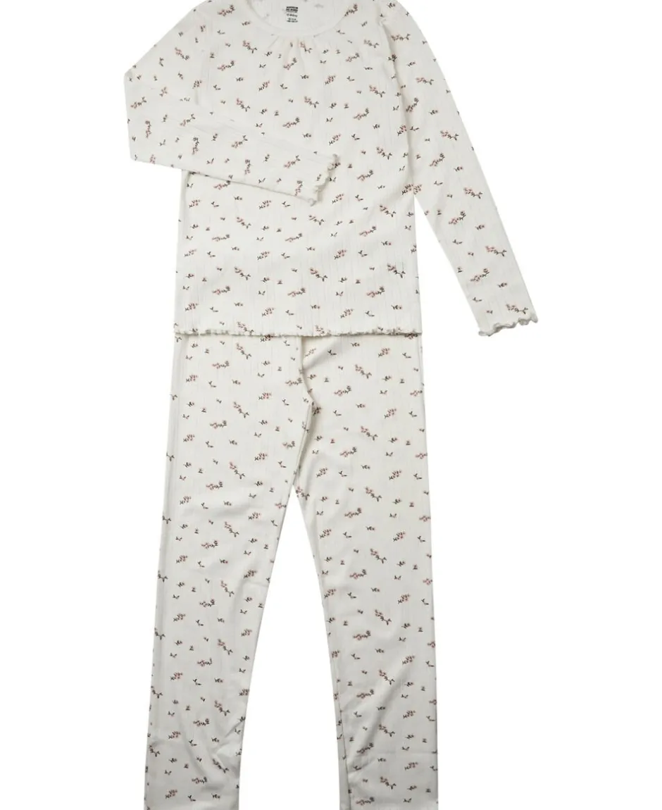 2-pak pyjamassæt fra Magasin du Nord Collection i den blødeste kvalitet af 100% økologisk bomuld med GOTS-certificering. Sættet består af en langærmet bluse samt et par løse bukser. Begge i den lækreste, komfortable kvalitet med et fint hulmønster samt bølge- og blondekanter.