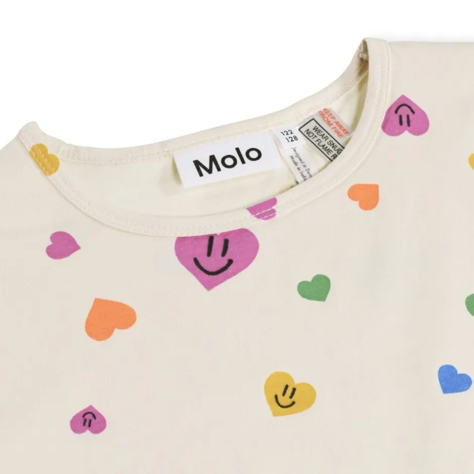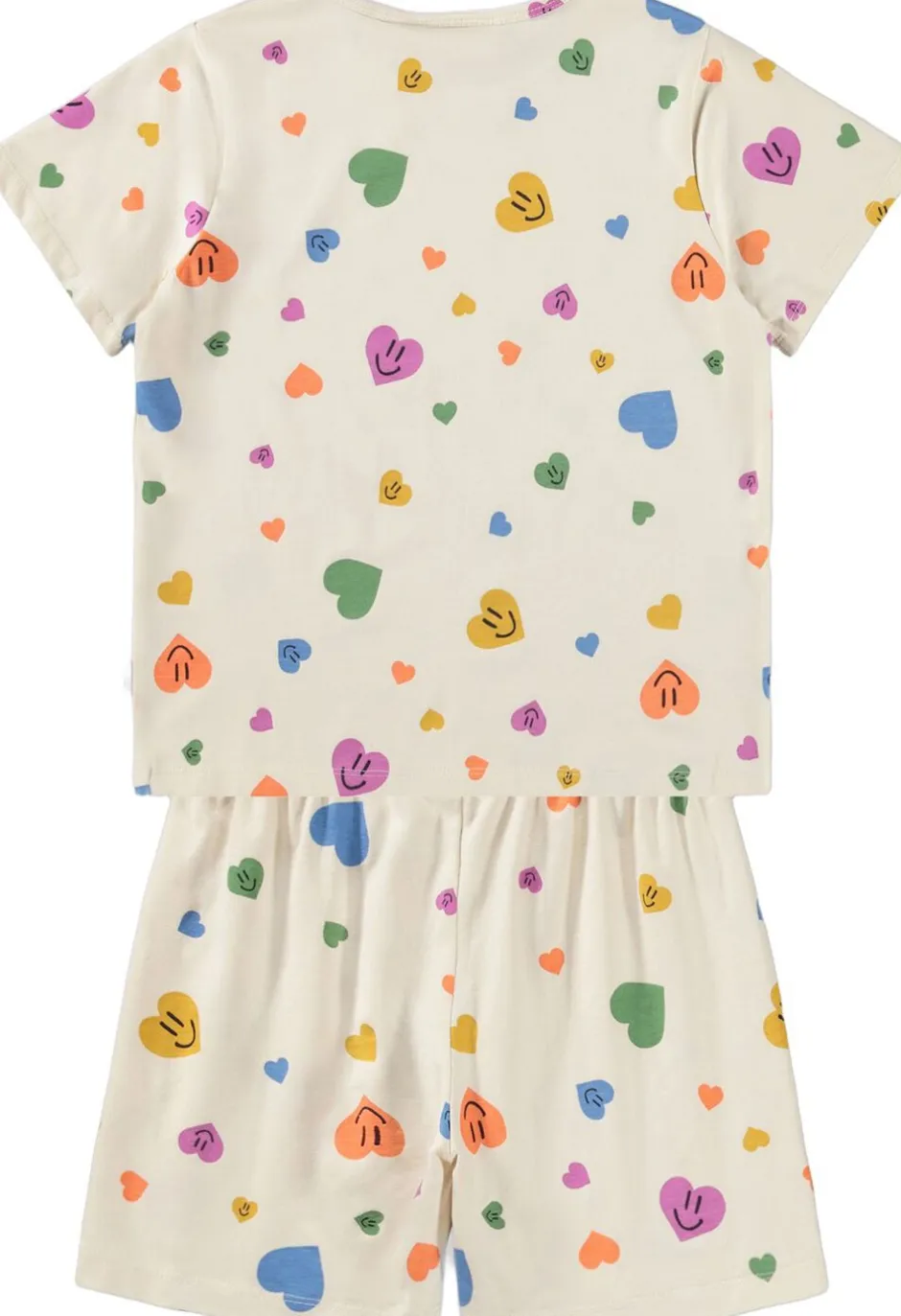 Lækkert nattøj med korte ærmer og ben, fremstillet i blødt, strækbart bomuld. Dette todelte sæt inkluderer en løs t-shirt med rund hals og shorts med elastik i taljen for optimal komfort. Det festlige print af smilende hjerter gør det til et sjovt valg til sengen, som både børn og forældre vil elske. Perfekt til afslappede nætter og hyggelige stunder.