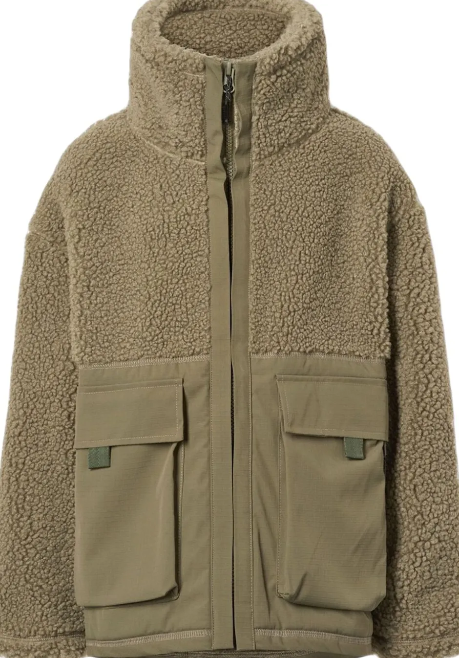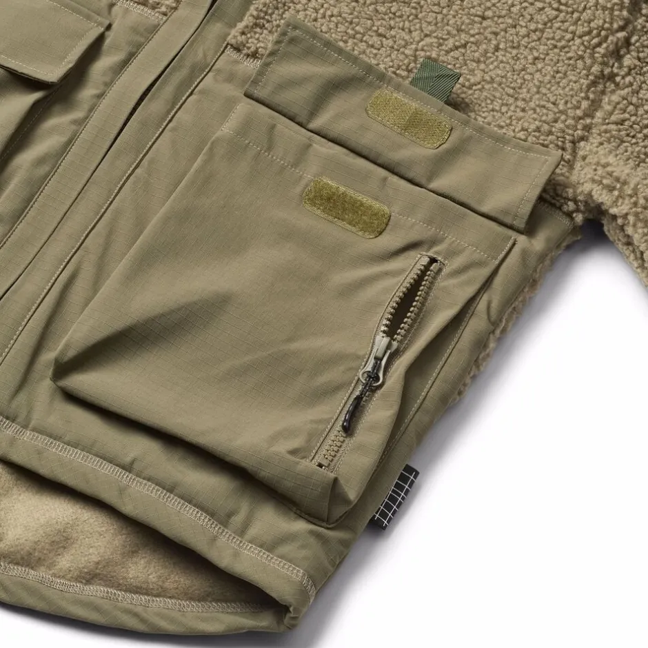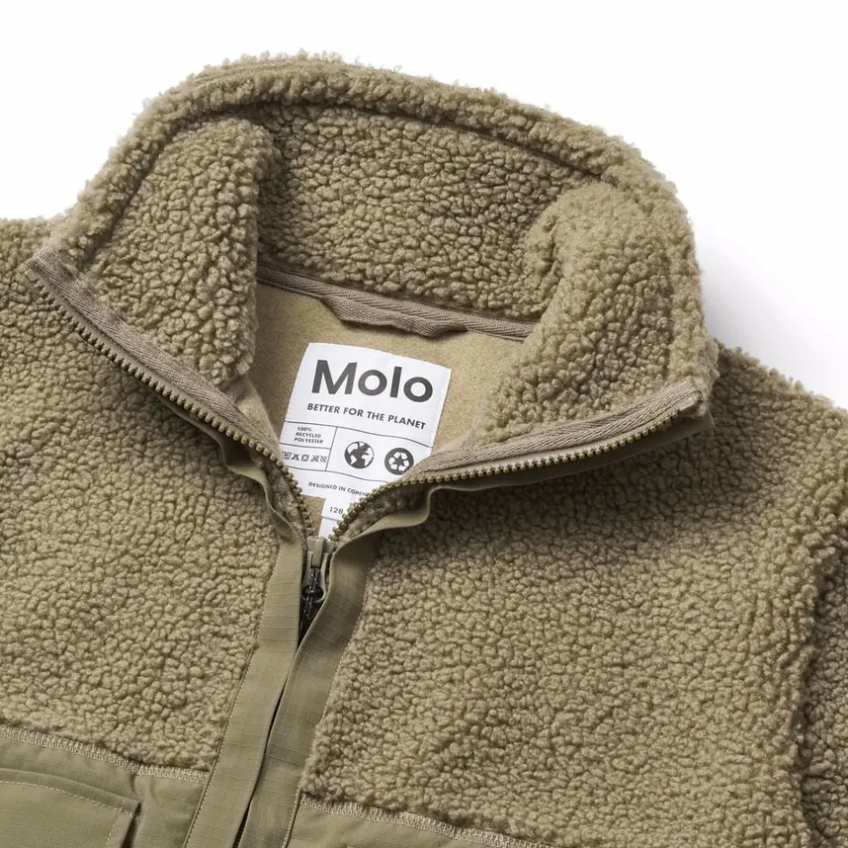 Denne mørkegrønne fleecejakke fra Molo er lavet i genanvendt polyester og har vind- og vandafvisende, slidstærke nylonpaneler på ærmer, ryg og frontlommer. Jakken har en høj krave og lynlåslukning på fronten.