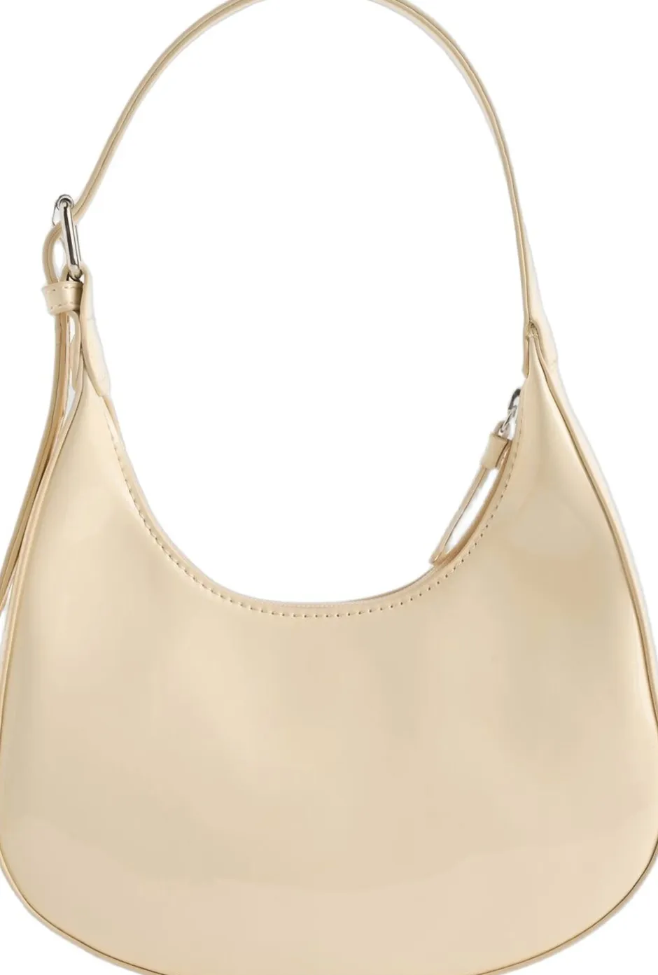 Skuldertasken er designet med en elegant buet form og en blank lakfinish, der tilføjer et strejf af stil til enhver påklædning. Med en praktisk lynlåslukning sikrer tasken, at indholdet forbliver sikkert, mens den justerbare rem gør det muligt at tilpasse tasken perfekt til dit barns behov. Det er en stilfuld og funktionel accessory til hverdagens eventyr.