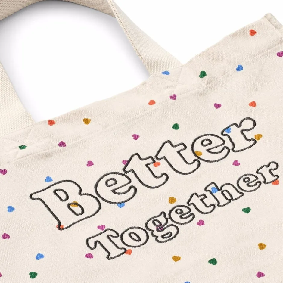 Tote bag i ubleget bomuld med et farverigt hjerte- og tekstprint, perfekt til hverdagens eventyr. Denne alsidige taske måler 38 cm i bredden og 28 cm i højden, hvilket gør den ideel til opbevaring af bøger, legesager eller snacks. Designet med komfort i tankerne, sikrer den nem bæring, mens den tilfører et legende præg til ethvert outfit.