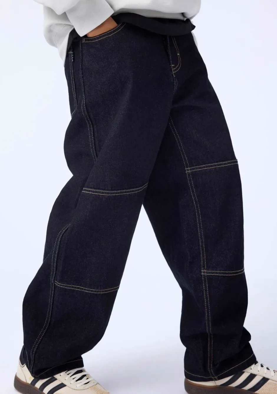 Disse mørkeblå oversize jeans fra Molo er lavet i rå denim med lyse stikninger ved knæene. Jeansene har 5 lommer, bæltestropper og en oversize pasform. Livvidden kan justeres med en indvendig elastik for optimal pasform til alle børn. Størrelser 92-134 har trykknap, mens størrelser 140-176 har en almindelig jeansknap. For en mindre løs pasform anbefales det at vælge en størrelse mindre, især hvis barnet er mellem to størrelser.