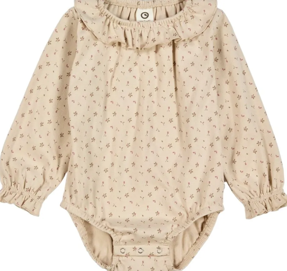 Skøn body med lange ærmer og sød og dekorativ flæsekrave. Der er elastik i ærmeafslutningen. Bodyen har elastik i halsåbningen og åbnes i bunden med tryk knapper. Fremstillet i en dejlig blød og strækbar 2×2 rib med elastan for at opnå højere komfort og længere holdbarhed. (GOTS Organic Certified by Ecocert Greenlife Lic. No. 151714). Produktet er GOTS organic- certificeret, hvilket betyder at bomulden er certificeret økologisk, og at der i alle andre processer som farvning, strikning og syning er taget de strengeste hensyn til miljøet. GOTS er internationalt anerkendt som den førende standard for forarbejdning af tekstiler af økologisk bomuld. Derudover tages der også hensyn til arbejdsforholdene, hos dem der producerer tøjet. Økologisk bomuld 95%, Elastan 5%