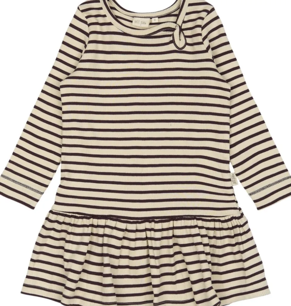 Langærmet kjole i vores klassiske stribede rib kvalitet. I venstre side af halsåbningen har vi vores signaturåbning med trykknap for nemt tøjskift. Kjolen har en lav overskæring med rynk i bunden for at give det feminint udtryk. Materialet er blødt og meget strækbart, designet til komfort og leg. Produceret i Indien.