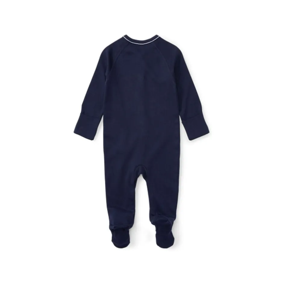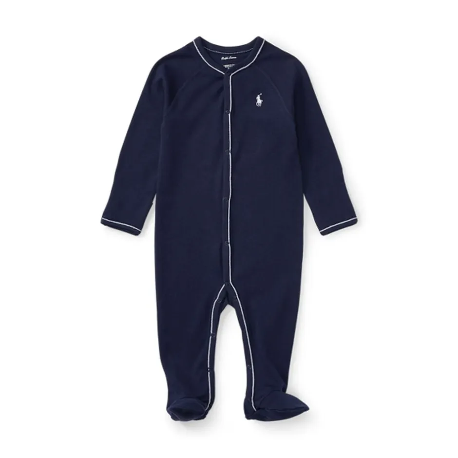 Natdragt fra Ralph Lauren i den blødeste kvalitet af 100% bomuld. Dragten er enkel i modellen med en diskret logodetalje på fronten, lange ærmer og ben, smalle ribkanter, lukkede fødder samt trykknapper på fronten og ned imellem benene.