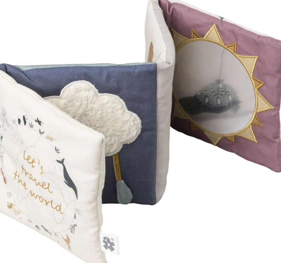 Bogen af stof kan vendes efter humør, og der kan digtes mange historie ud fra motiverne. Brug stofbogen i liften eller i barnevognen, når baby har brug for en hyggestund, eller når I skal på tur. Den kan også bruges som motivation til at løfte hovedet og træne nakkemusklerne, når I leger på gulvet sammen.