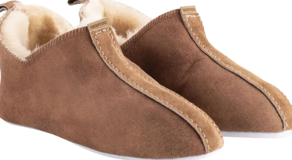 Shepherd Viared. Børnesutsko i fåreskind. Sutskoene er udformet i en lav, ankelhøj model med en lille slids i siderne, hvilket gør dem lette at tage af og på. Dekorative kantbånd i ruskind og en strop bagtil. Blød sål i ruskind.