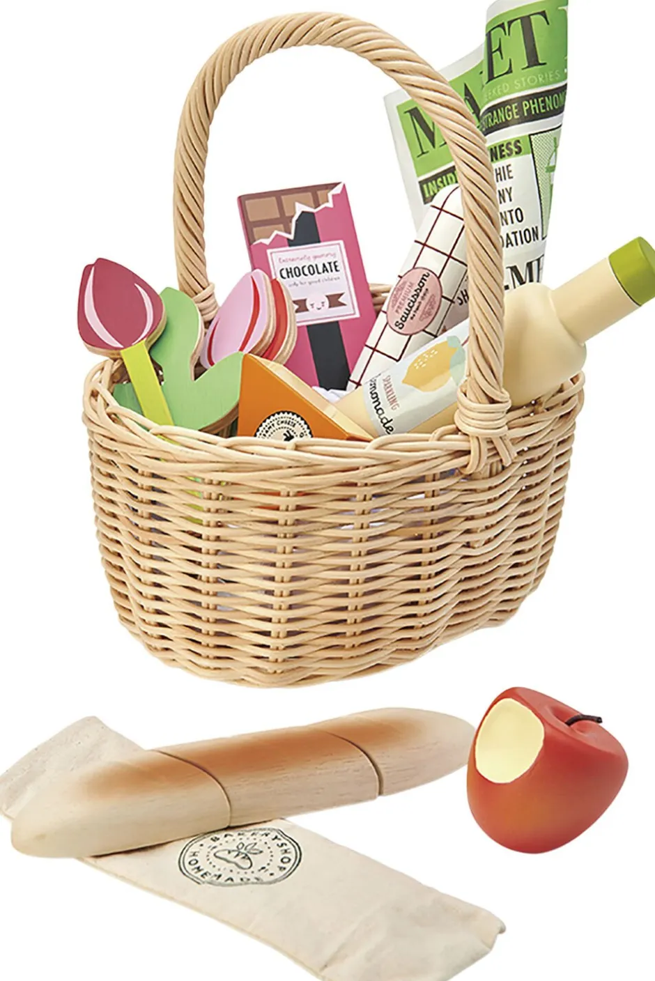 Indeholder: Flettet kurv med hank, dagens avis, flute i stofpose, en plade chokolade, limonade, salami, brieost, tre tulipaner og et æble, som der er taget en bid af.