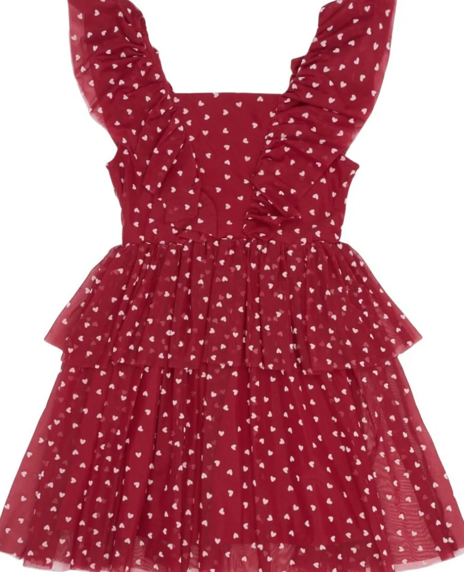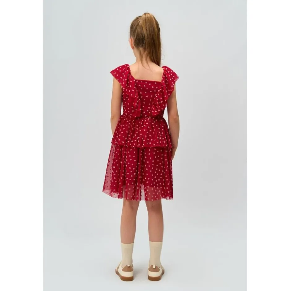 Sød og romantisk kjole fra THE NEW, der emmer af elegance og leg. Kjolen har fine flæsedetaljer ved skuldrene og skørtet, som giver et smukt, voluminøst udtryk. Det lette mesh-stof er dekoreret med små hjerter. Kjolen er opbygget i to lag med blødt og åndbart bomuld på indersiden, samt et ydre lag af blødt, gennemsigtigt mesh-stof. Den har en praktisk lynlås i siden, som gør den nem at tage af og på, og den elastiske talje giver en god og fleksibel pasform. Perfekt til særlige anledninger, hvor der skal lidt ekstra charme til. – Kort kjole med en længde der slutter lige over knæene. – Normal pasform med a-snit og elastisk der fremhæver taljen. – Ærmeløs. – Flæsekant langs stropperne. – Sødt hjerteprint. – Lynlås i siden af kjolen.