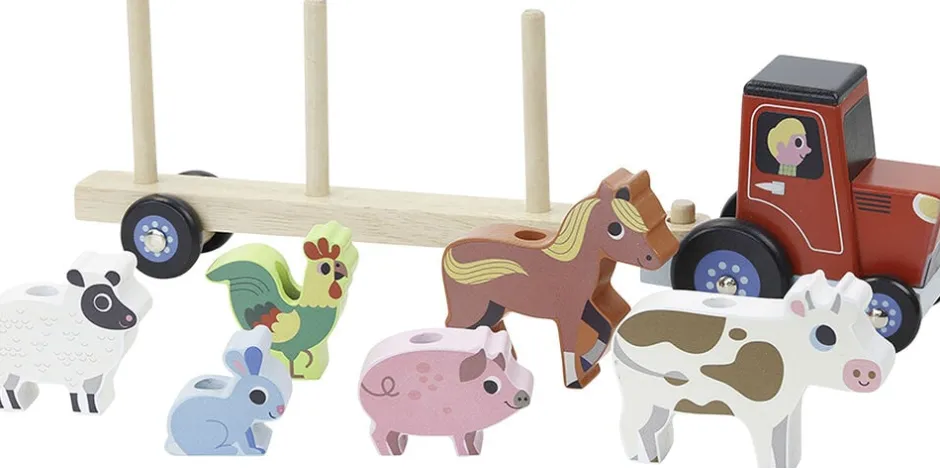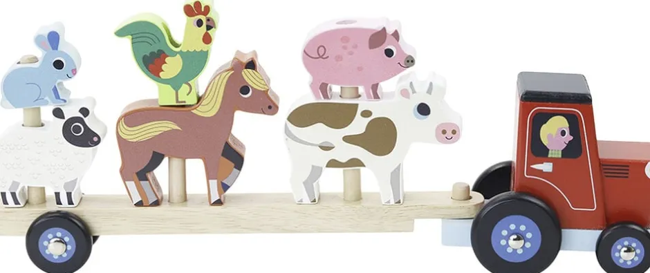 Traktor og anhænger med dyr, der kan stables: Kanin, lam, hest, hane, gris og ko.