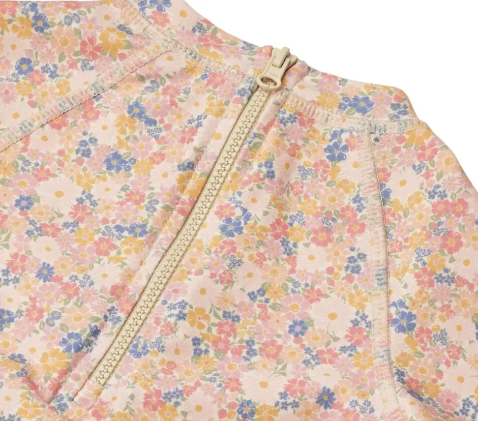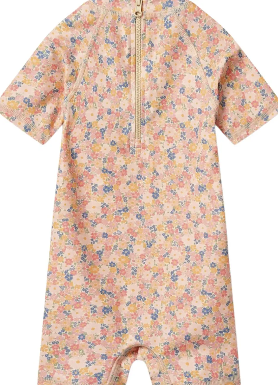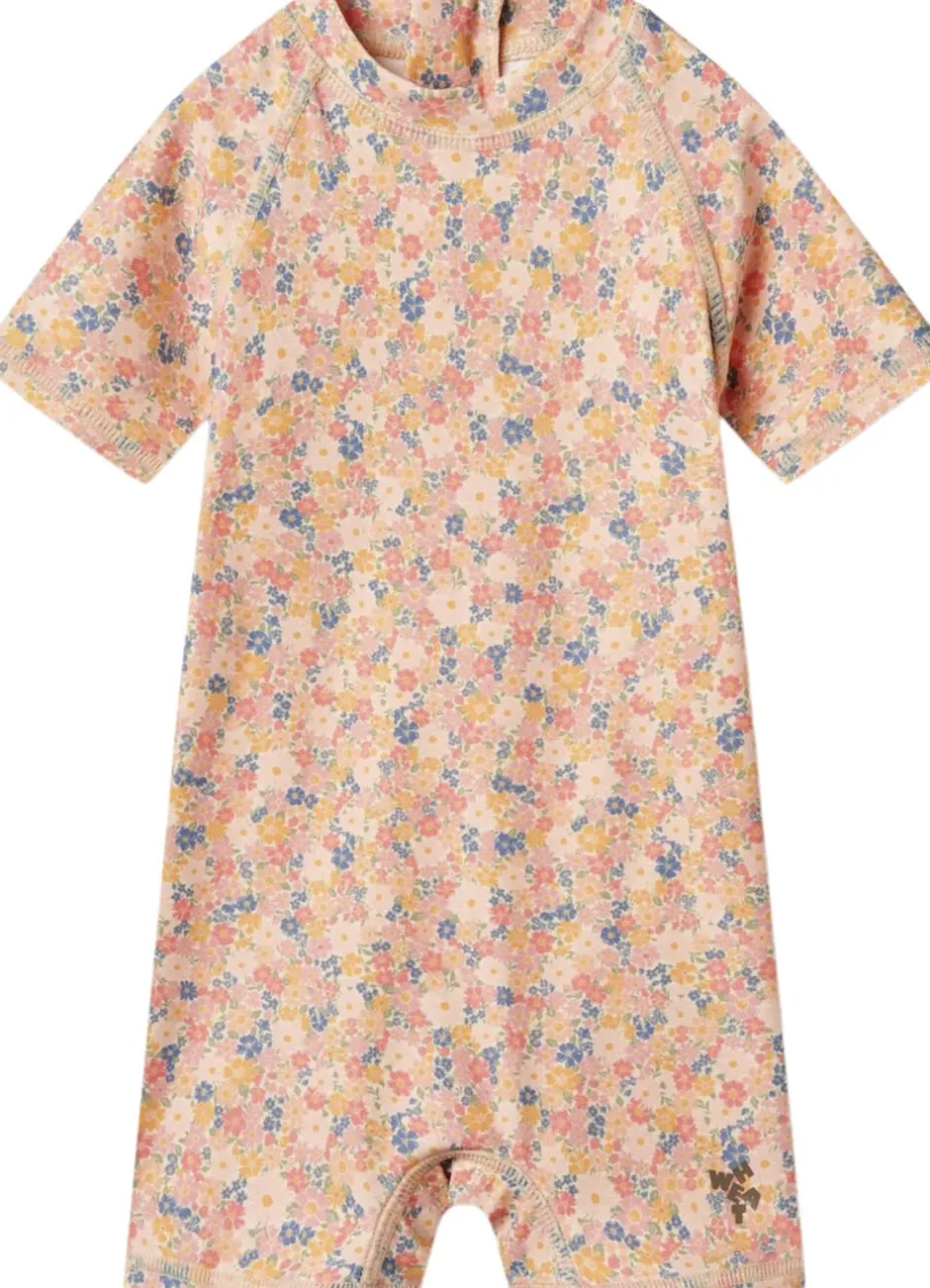 Praktisk badeheldragt med korte ærmer og ben til din baby. – Tæt pasform – Lille krave – Lynlås ned bagpå – Raglanærmer – Unisex – Wheat signaturprint Wheats badetøj er perfekt til en dag på stranden, ved poolen eller blot til vandleg i haven. Alt vores badetøj er overvejende produceret i genanvendt polyester, og er yderst behageligt for dit barn at have tæt på kroppen. Badeheldragten har en lille krave til at beskytte hals og nakke, samt raglanærmer, så dit barn ikke bliver udsat for sol på de sarte områder af kroppen. Desuden har den en lynlås bagpå, så det er nemmere for dig at iklæde dit barn. Stylen er med UV 40+/UVF 40+ beskyttelse og er Standard 100 fra OEKO-TEX® certificeret. Forlæng dit badetøjs levetid: – Ved altid at skylle dit badetøj efter badning i klor- eller saltvand. – Ved at følge vaskeanvisningerne — – Standard 100 af OEKO-TEX® – 83% Genanvendt polyester, 17% Elastan – GRS certificeret