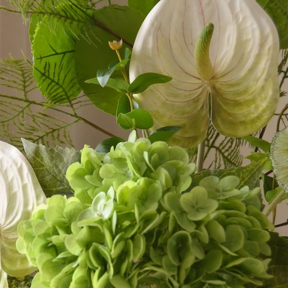 Denne buket indeholder en harmonisk blanding af bløde grønne og naturlige teksturer, der skaber en frisk og fredfyldt sammensætning. Svampehydrangeablomster tilføjer fylde, mens skulpturelle anthurier og delikate frøplanter introducerer raffinerede detaljer. Flowing amaranthus og luftige bregner bringer bevægelse, suppleret med struktureret løv til dybde. Denne buket indeholder i alt 10 stilke. Bourquetten når en højde på 85 cm på sit højeste punkt, men alle stilke kan let bøjes og justeres for at opnå den ønskede højde og form til ethvert arrangement. Den store keramiske jordvase på billedet måler 30,5 cm i højden og 10 cm i diameter.