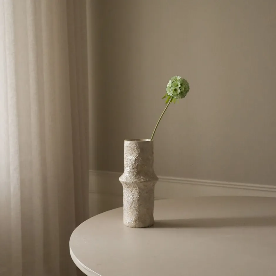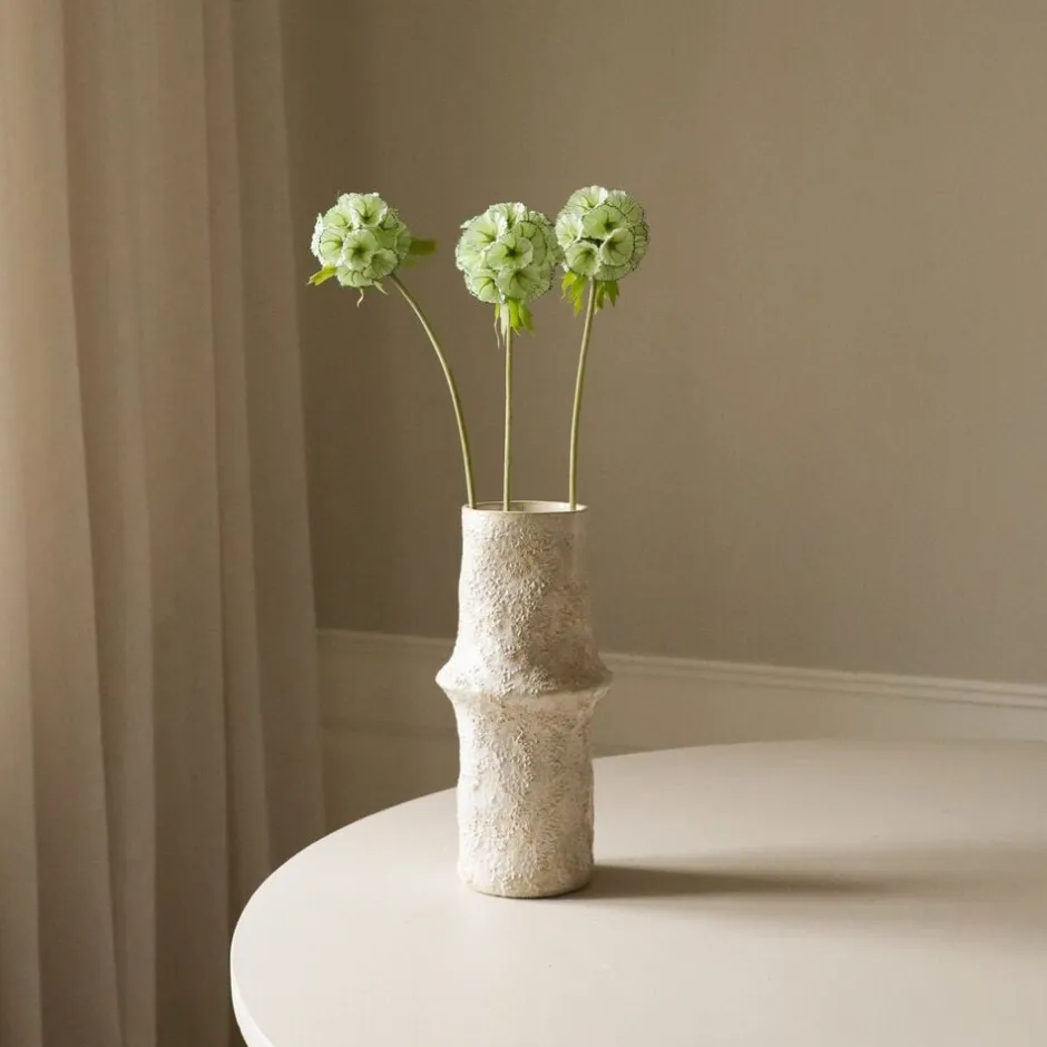 Denne lysegrønne scabiosa-podblomst har delikate, afrundede frøkapsler med en diskret grøn nuance og fine, mørkekantede detaljer. Bælgene er arrangeret på slanke, lysegrønne stilke og når en højde på 57 cm. Den store keramiske jordvase på billedet måler 30,5 cm i højden og 10 cm i diameter.