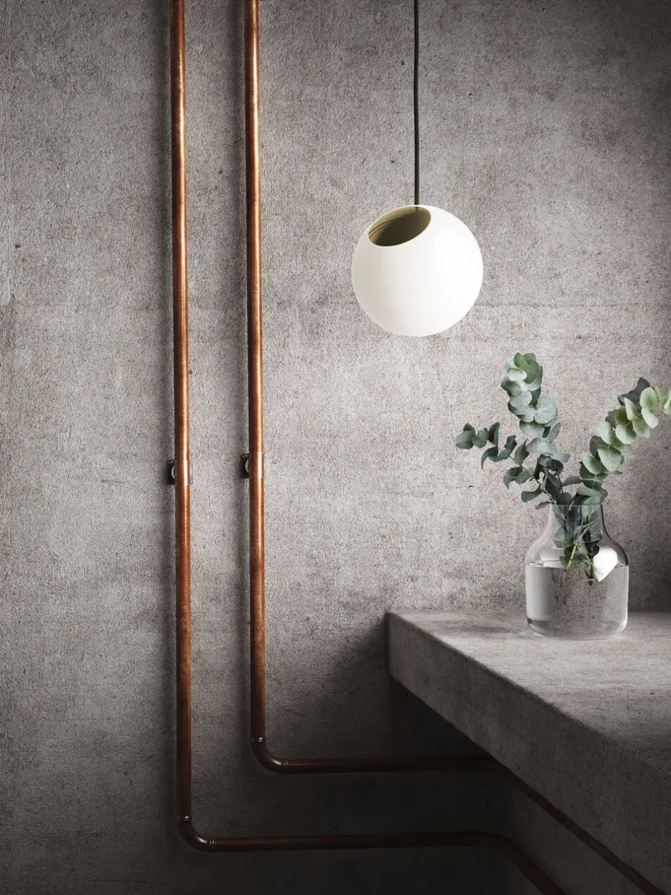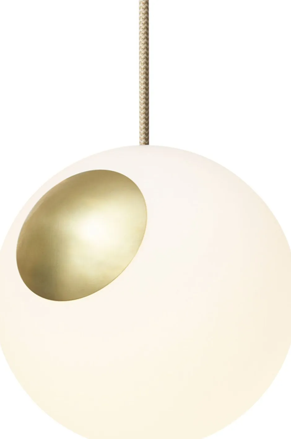 Lampen er lavet af en mundblæst kuppel i hvid opal glas med en indsat gylden messing plade, som er en perfekt kombination.