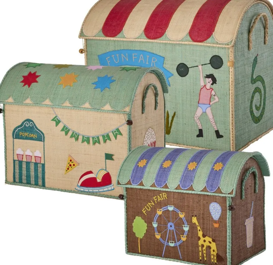 Raffiahuse i sæt af tre forskellige størrelser med temaet Fun Fair. De fungerer ikke kun som en fantastisk tilføjelse til leg, men også som den ideelle opbevaring til legetøj, bøger og tæpper. Hvert hus er omhyggeligt håndlavet på det smukke Madagaskar.