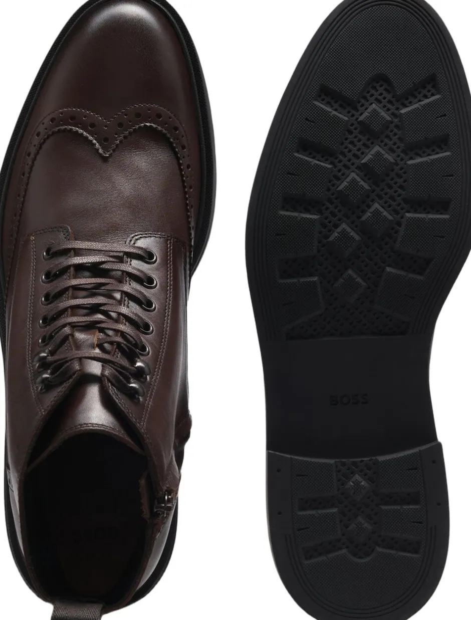 Med klassisk brogueing bliver disse BOSS herretøj-halvstøvler en hverdagsfavorit. Fremstillet i rigt læder med en diskret signaturstribedetalje. Dette produkt indeholder mindst 60 % bedre råmaterialer. Vi søger løbende efter mere ansvarlige måder at producere og færdiggøre vores produkter på. minimum 60 % af det læder, der bruges til at fremstille dette produkt, er indkøbt fra certificerede garverier