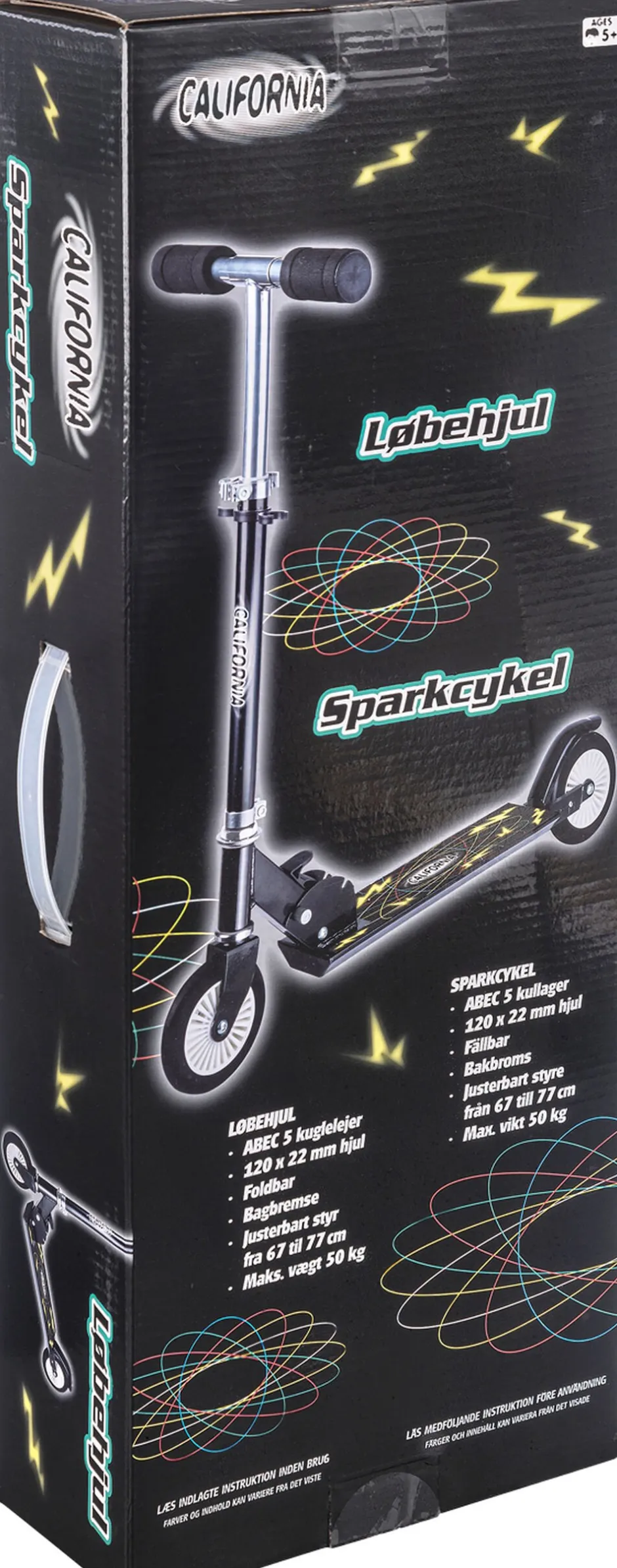 California sort løbehjul. 120×22 mm hjul ABEC 5 kuglelejer Slide lock-foldemekanisme Justerbart styr fra 65-75 cm Håndtag i EVA-skum Bagbremse Kan bære 50 kg