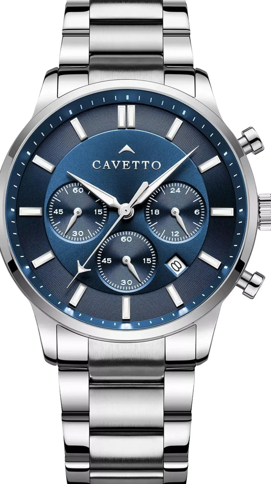Cavetto Pantheon CV0002 er et ur, der kombinerer funktionalitet med et stilrent design. Med en diameter på 42 mm gør det et stærkt indtryk på håndleddet. Den runde urkasse har en metallisk finish, med en blå urskive, der tilføjer et strejf af elegance. Urskiven inkluderer tre kronografer, der tilbyder en praktisk og visuelt tiltalende detalje. Enkle lineære markører giver et rent udseende, som komplementeres af den sølvfarvede urkasse og bezel.
