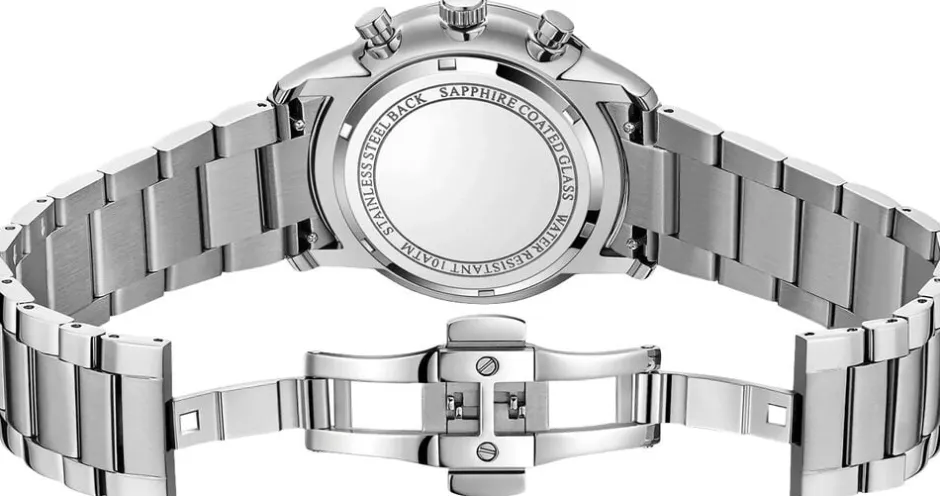 Dette kronograf-stil ur er udstyret med kvarts urværk og tilbyder essentielle funktioner som datovisning og stopur. Lænken i rustfrit stål i sølv er sikret med en foldelås, hvilket sikrer komfort og nem brug. Med en vandtæthed på 10 ATM er dette ur velegnet til svømning. Lumen på viserne sikrer synlighed i mørket, hvilket øger dets praktiske anvendelighed. Uret er beskyttet af safirbelagt mineralglas, hvilket forbedrer dets holdbarhed.