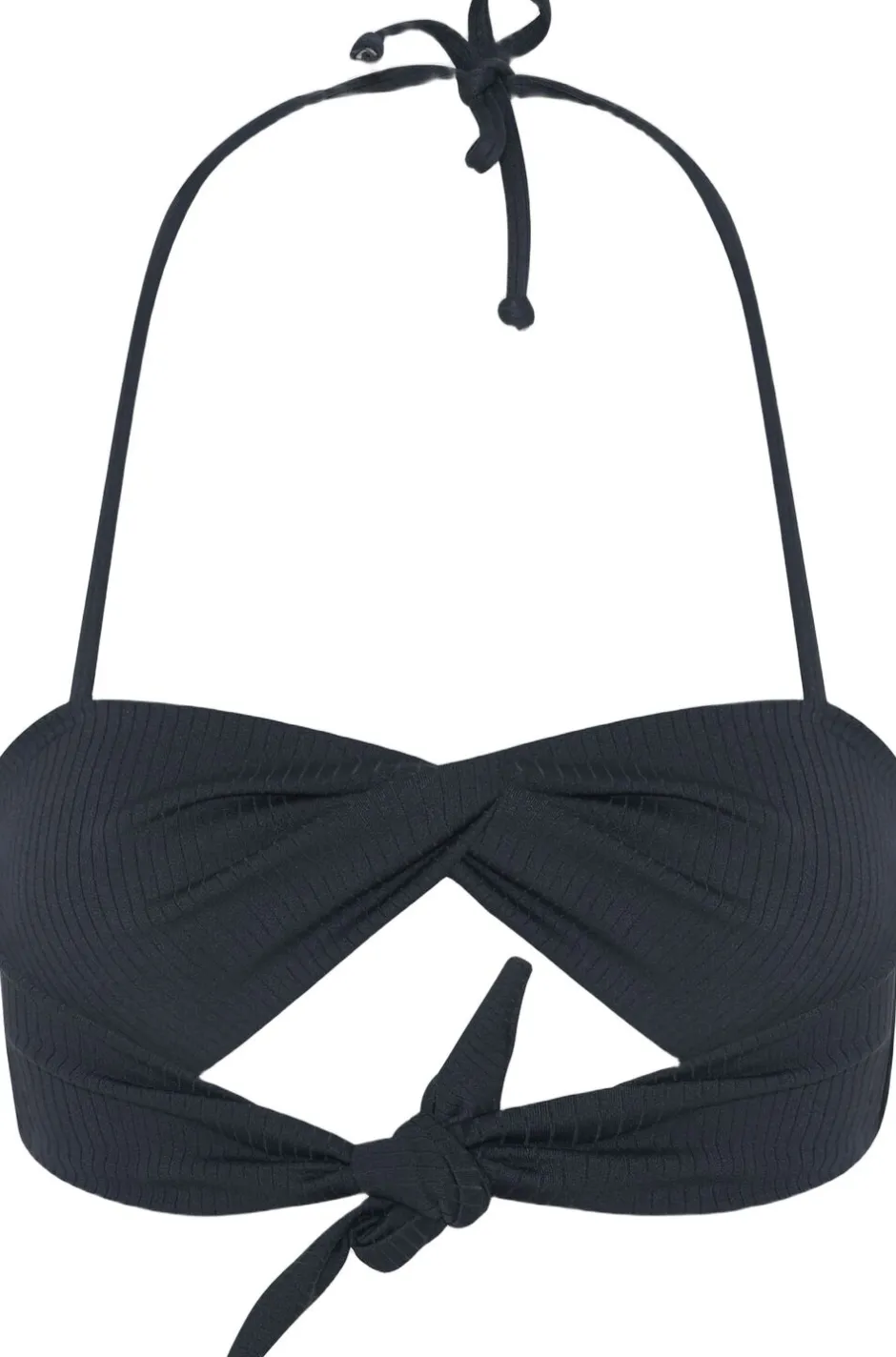 Charlotta bikinitoppen i sort rib er en smuk kombination af tekstur og enkelthed. Den bløde, ribbede kvalitet føles behagelig mod huden og følger kroppen uden at stramme. Med sin feminine twist-detalje og justerbare bindelukning er den både afslappet og elegant perfekt til stille dage ved havet.