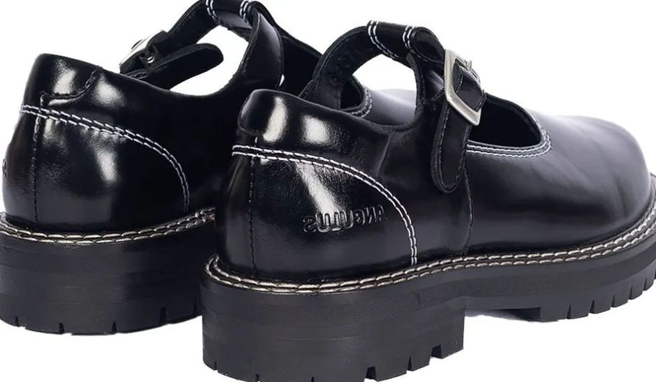 Chunky Mary-Jane i læder med dekorative kontraststikninger.