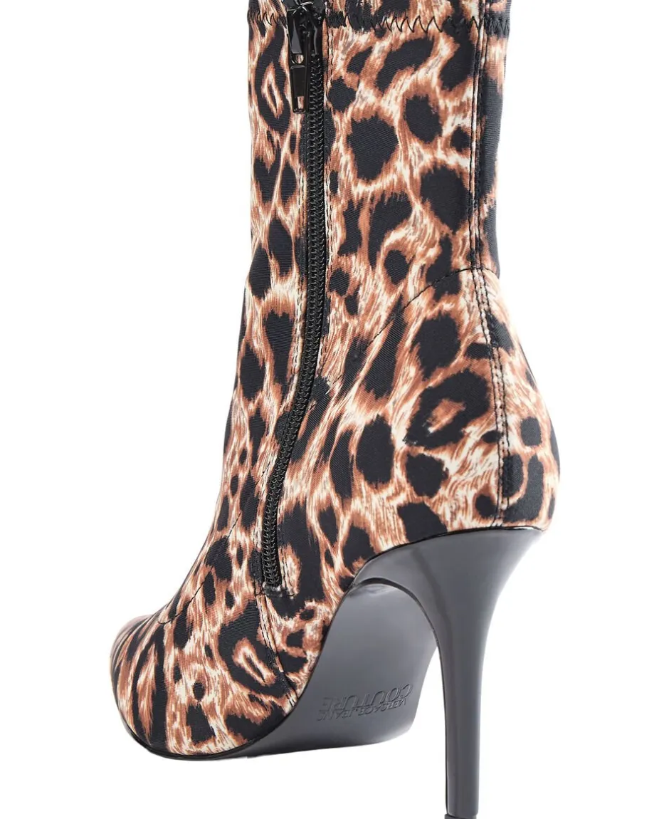 Støvle fra Versace Jeans Couture i en smuk kvalitet med et leopardprintet mønster. Støvlen er enkel i modellen med en slank pasform, lynlåslukning på indersiden, en hæl på 8,5cm samt den flotteste, metalliske detalje omkring støvlens spidse snude. Dustbag medfølger.