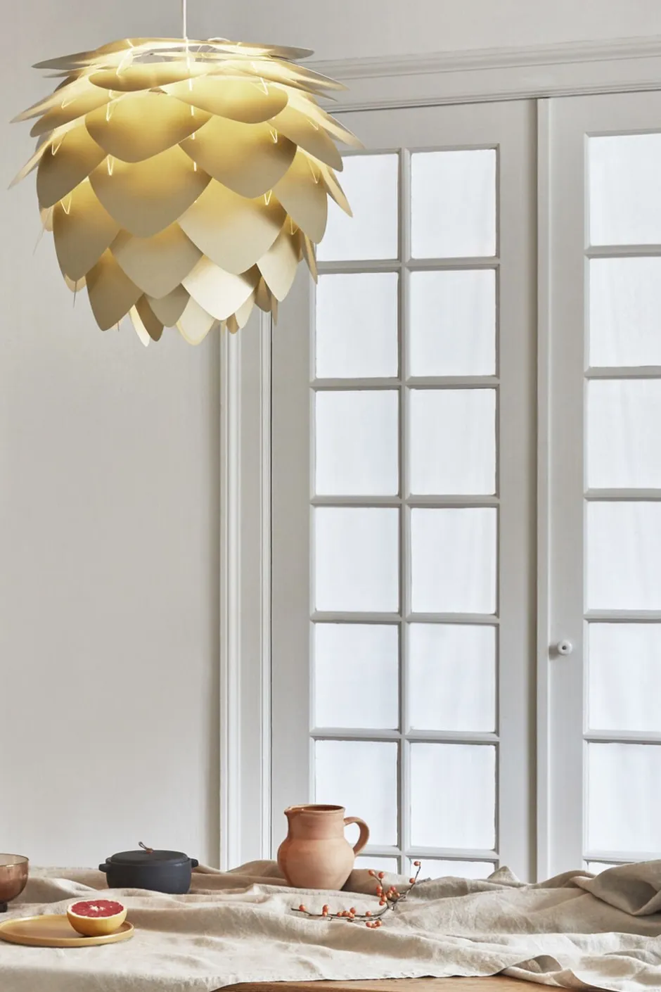 Inspireret af naturen med sine karakteristiske trekantede kronblade, kaster Aluvia i børstet messing et varmt og blændende omgivende lys, der ser lige så godt ud, som det tænder.