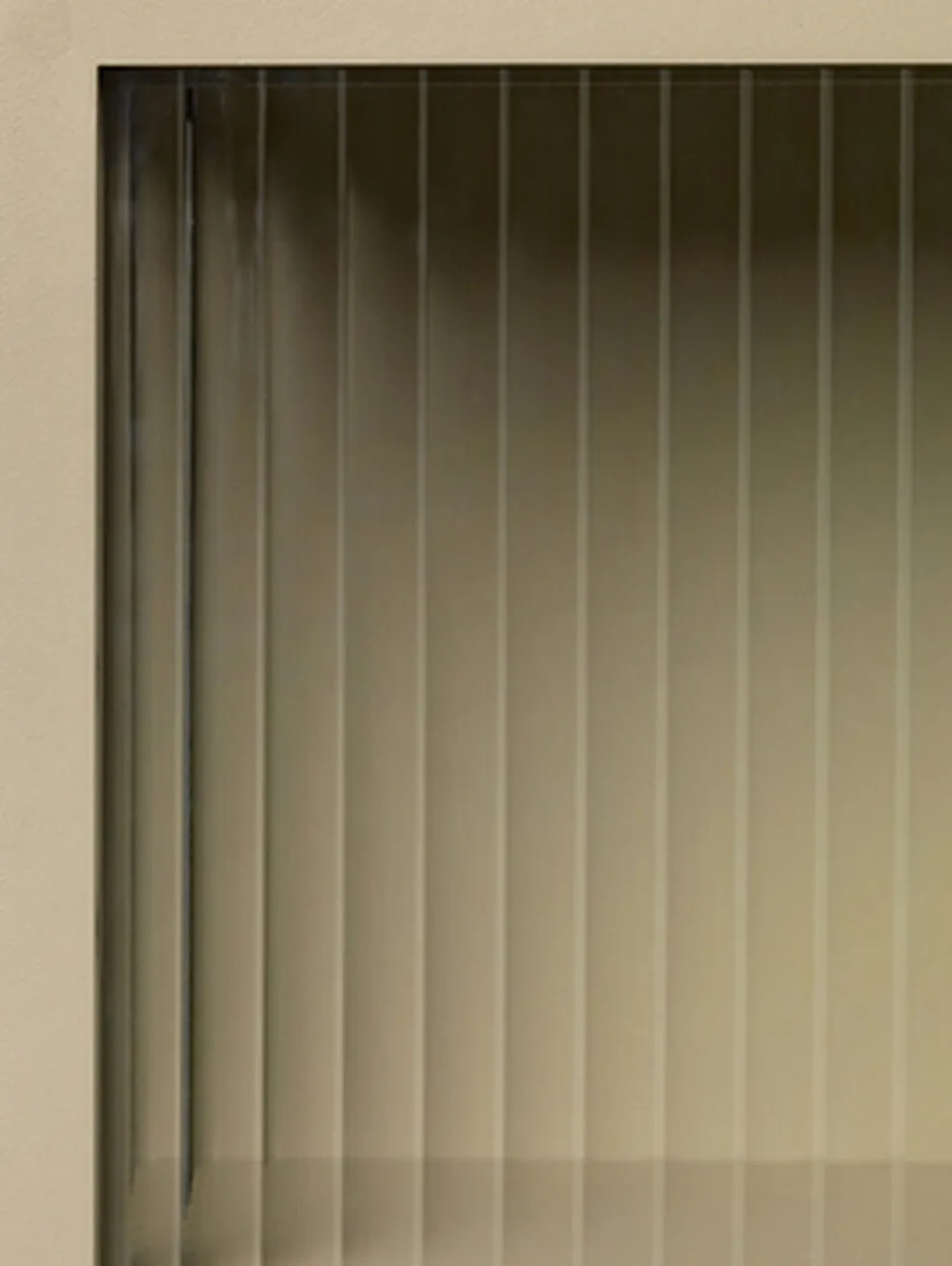 Haze-vægskabet har den samme industrielle æstetik som vores Haze-vitrineskab, og er, som navnet antyder, et praktisk vægmonteret skab til opbevaring af mindre genstande. Det er udformet i pulverlakeret stål i en blød kashmirfarvet nuance og udstyret med elegante rillede glaspaneler og en dør, og er den ideelle løsning til opbevaring af briller i køkkenet eller skønhedsprodukter i badeværelset. Det fungerer også særdeles godt i en gang fyldt med ting til hverdagsbrug, såsom nøgler og solbriller.