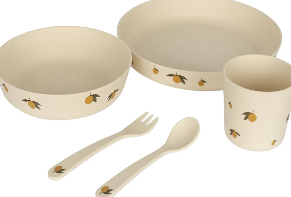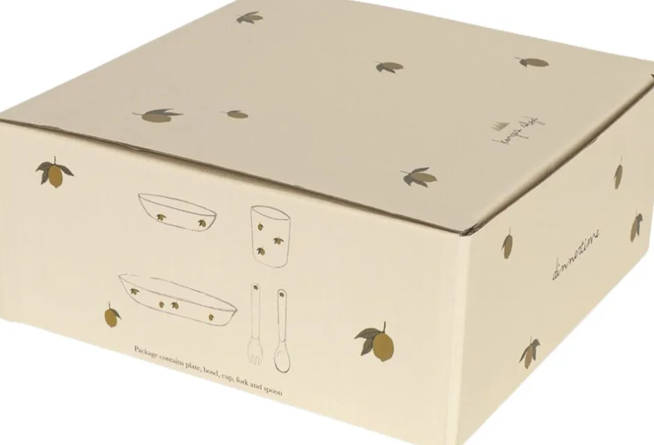 Middagssæt fremstillet af 100% Polyactide (PLA). Tåler ikke opvarmning eller kontakt med fødevarer over 70°C. Ikke egnet til mikrobølgeovn. Tåler opvaskemaskine. Tallerken: H: 3,55 cm x D: 19 cm, skål: H: 3,55 cm x D: 19 cm: H: 4,35 cm x D: 14,5 cm, Kop: H: 4,35 cm x D: 14,5 cm: H: 7,5 cm x D: 7 cm, Bestik: H: 7,5 cm x D: 7 cm, Bestik: B: 2,5 cm x L:13,5 cm x D: 0,5 cm. Testet og opfylder EU’s regler om fødevarekontakt 10/2011 og 1935/2004.