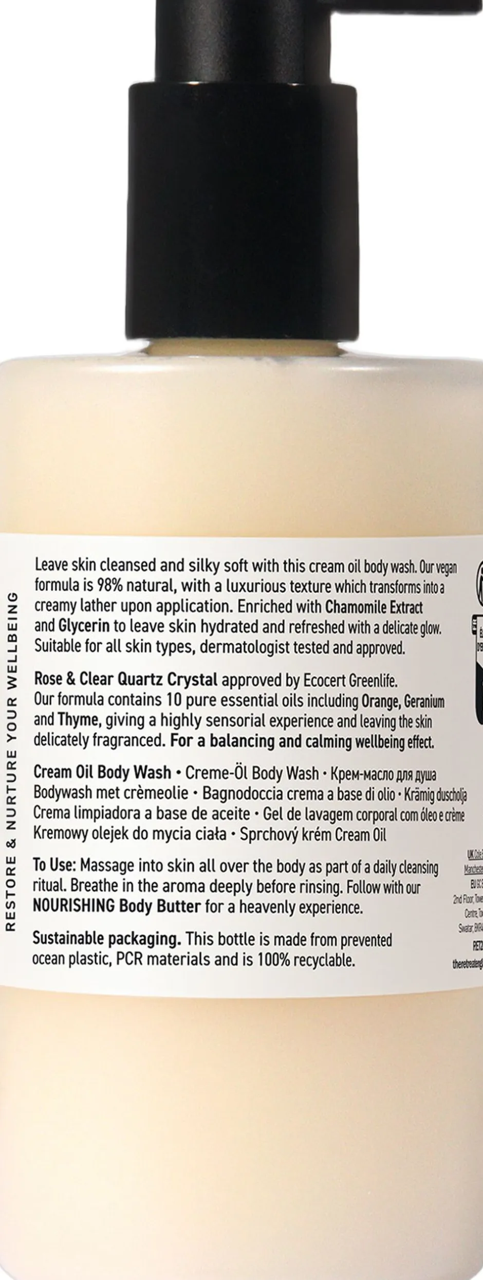 300 ml. body wash med rose og klar quartz-krystal blanding, der efterlader huden blødgjort og hydreret. Luksuriøs tekstur og formel, der udvikler sig til en cremet konsistens i kontakt med vand. 98% naturlig formel beriget med beroligende kamille og fugtgivende glycerin.
