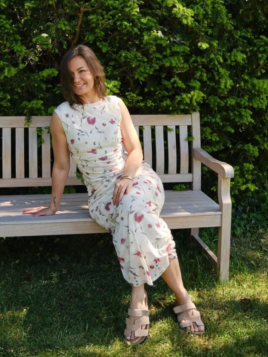 Lang kjole i mesh med blomsterprint. Kjolen er ærmeløs, har en rund halsudskæring og draperede detaljer. Den er med for og har en tætsiddende pasform. Modellen er iført størrelse 36.