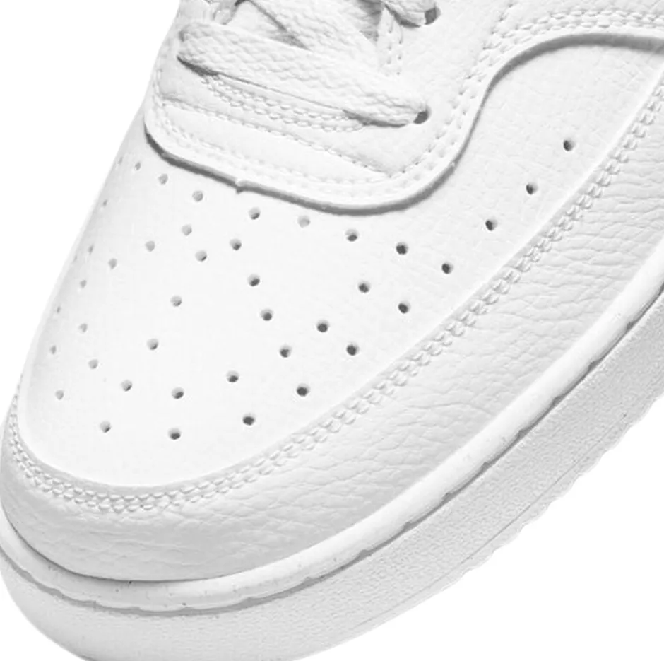 Nike Court Vision Low Next Nature sneakers er fremstillet med mindst 20% genanvendte materialer, har en slidstærk overdel og syede stafferinger. Den polstrede krave arbejder sammen med gummiydersålen for komfort og greb til de mange skridt i løbet af dagen.
