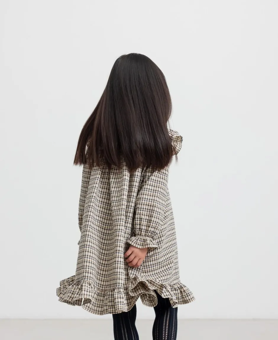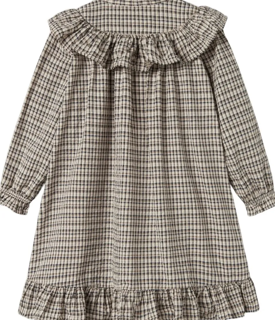 Behagelig langærmet kjole i crepet bomuld med god pasform, krave der går hele vejen rundt med fine bølgede kanter og bølgebånd forneden samt på ærmer. Kjolen lukkes med knapper foran og længden går til over knæene.