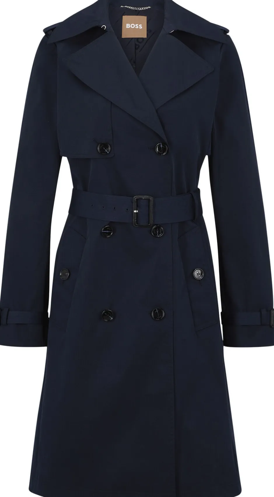 – Stilfuldt design: Den dobbelte knaplukning og det karakteristiske bælte giver et skarpt og velovervejet look, der aldrig går af mode.