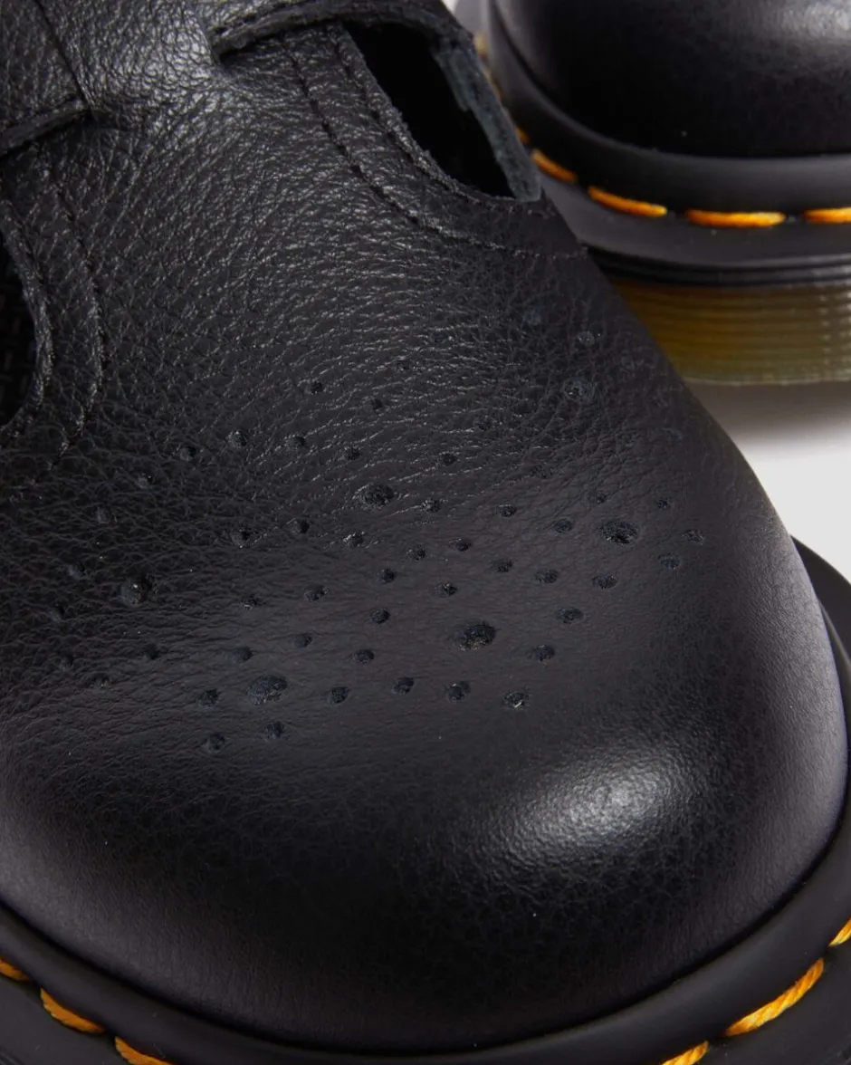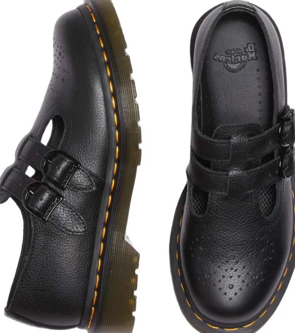 Dette er 8065: en moderne fortolkning af det klassiske skolepige-look, nu kombineret med den ikoniske og kompromisløse stil fra Dr. Martens. Skoen er designet som en elegant brogue med dobbelte remme og dekorative hestesko-spænder.