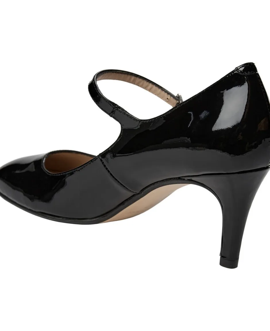 Elegante pumper lavet af patentlæder med en firkantet tå og en justerbar strop på overfoden. Materiale Patent Læderfarve Sort hæl 7 cm Størrelsesguide Normal