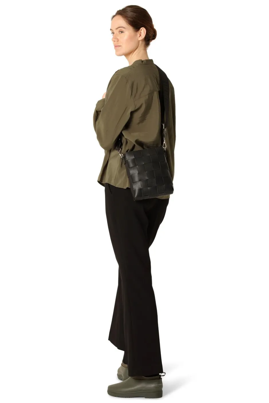 Krop i en rektangulær flettet imiteret læder. Tasken har