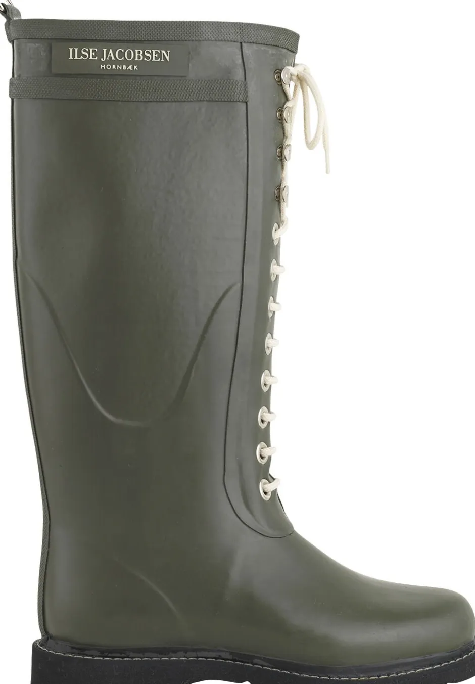 The iconic laced rubber boots by Ilse Jacobsen. These knee length rain boots features a decorative D-ring at center back and logo on the shaft. These wellingtons are made of sustainably harvested natural rubber and have been cut by hand. This material can withstand temperatures down to -20 degrees Celsius. The rubber composition is 80% pure, natural rubber and 20% secret formula. Entirely PVC-free, our boots contain no animal by-products. If not treated regularly, natural rubber will develop a white surface over the years. This is simply because the rubber will lose its essential oil. To keep your boots in great condition for many years to come, we recommend that you treat them once a month with our oil. New laces are available in several colors.