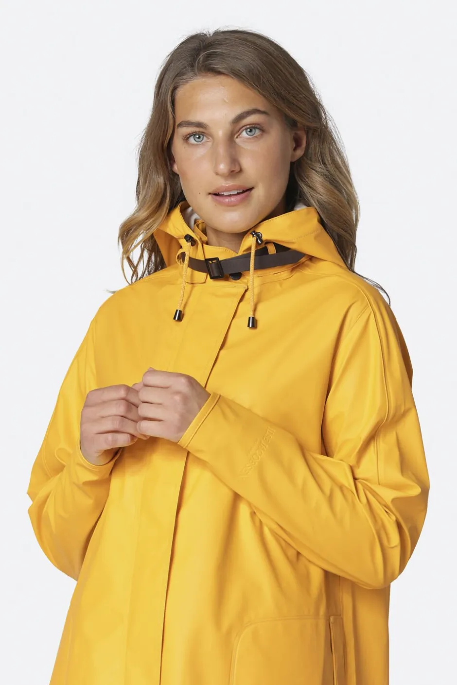 En feminin A-formet regnfrakke med Løs pasform under knæet. Regnfrakken har et diskret Ilse Jacobsen Hornbæk-logo præget på venstre ærme. Hætten er aftagelig og fastgjort med en vejrbestandig strop i kunstlæder. Stilen har sidelommer med flapper, smarte slidser i sidesømmene med trykknapper, knaplukning ved håndleddet og en 2-vejs YKK-lynlås midt foran. Indvendigt har stilen en ren og fin finish med et logobånd. Kvaliteten er en let og subtil vandtæt gummibelagt PU med polyester tricot på bagsiden, og alle sømme er dobbeltsvejsede. Stilen fås i et bredt udvalg af både klassiske og sæsonbestemte farver. Sammensætning: 100 % polyester trikot med PU-belægning. Funktionalitet: B/P 5000 mm