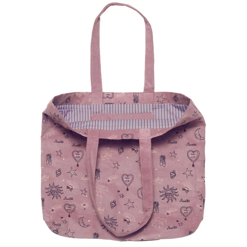Vores Corduroy Tote Bag forener praktik med elegance med sit mønster af stjerner, hjerter halvmåner og lokkende vifter, der tilsammen giver illusionen af scenens fortryllende sjæl.