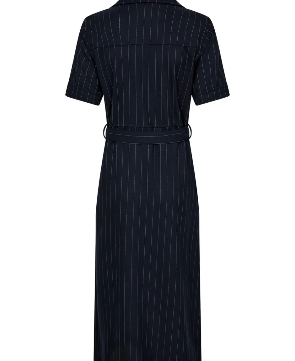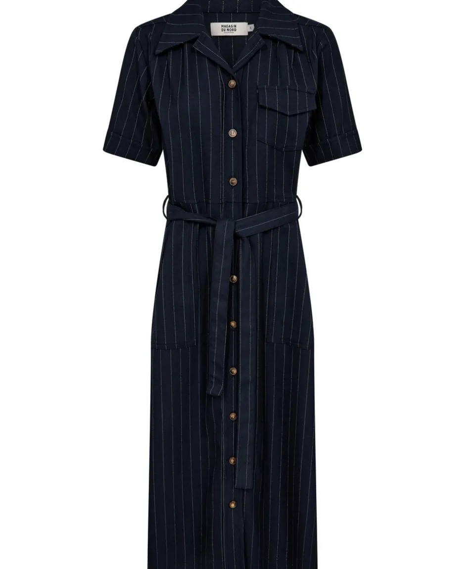 Skjortekjole fra Magasin du Nord Collection i den lækreste kvalitet af 63% genanvendte fibre med GRS-certificering. Kjolen har et fint, nålestribet print, hornknapper på fronten, korte ærmer, en åben krave, brystlomme, sidelommer samt et bindebånd i taljen. En skøn skjortekjole i en lækker kvalitet.