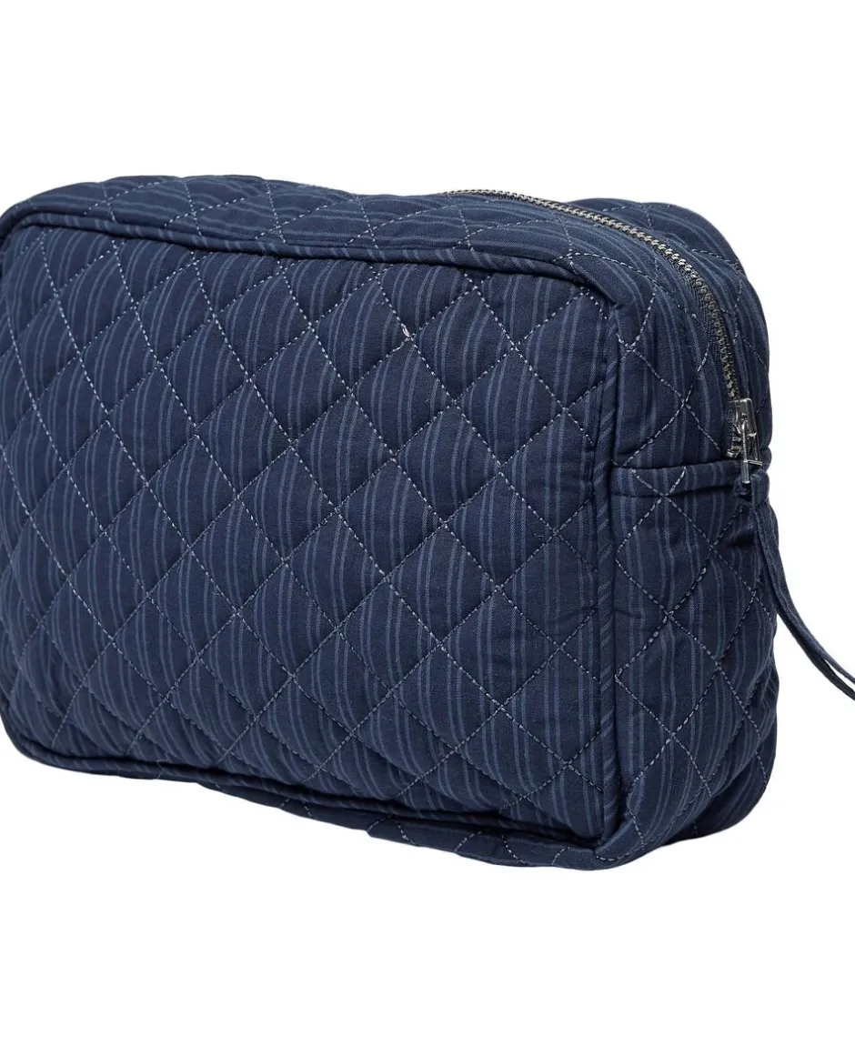 Toilettaske fra Magasin du Nord Collection i den blødeste kvalitet af 80% økologisk bomuld med GOTS-certificering. Toilettasken består af ét stort rum med lynlåslukning samt mindre inderlommer. Derudover har toilettasken fine vatterede syningsdetaljer og et stribet print. En skøn toilettaske i den lækreste kvalitet.